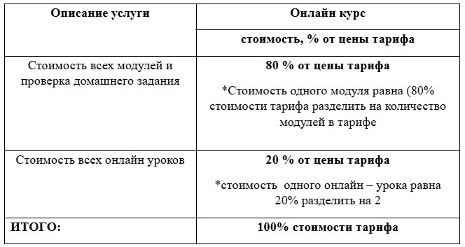 - 3 (три) модуля (включая уроки в записи), размещенных на обучающей платформе, в соответствии с программой обучения, указанной в настоящей оферте. График «открытия» уроков к просмотру указывается на обучающей платформе.