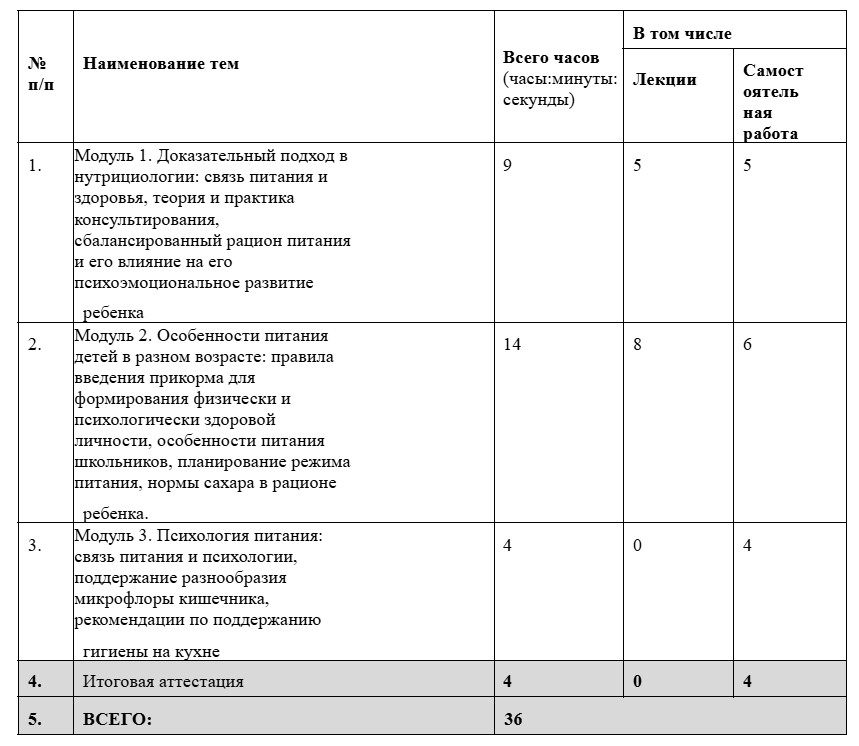 Цель программы: Целью программы является формирование у слушателей профессиональных компетенций, необходимых для выполнения нового вида деятельности, формирование навыков, необходимых для консультирования родителей и детей по вопросам здорового питания и формирования здоровых пищевых превычек.